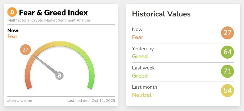 Antes do crash, o Índice de Medo e Ganância do Bitcoin do site Alternative.me apontava que o mercado estava animado, com uma pontuação de 64/100. No entanto, o medidor despencou rapidamente para 27/100, apontando “medo”.