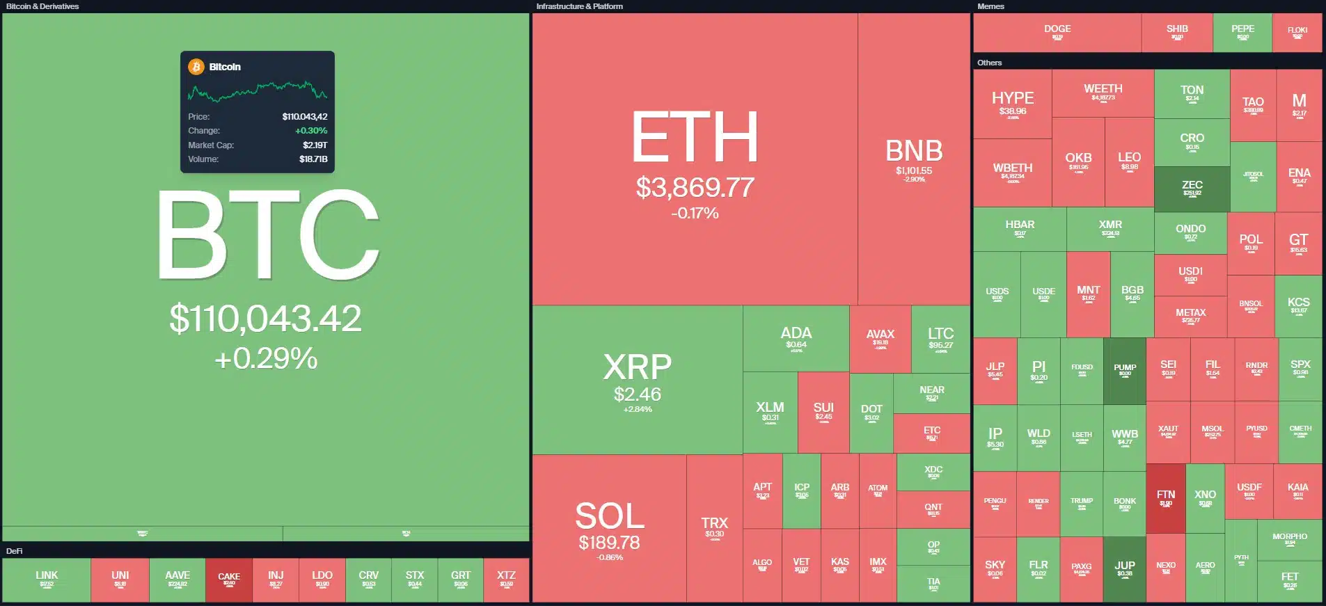 Bitcoin opera acima dos US$ 110.000, em leve alta de 0,3% nas últimas 24 horas. Outras criptomoedas acompanham essa falta de reação, incluindo Ethereum, BNB, XRP e Solana.