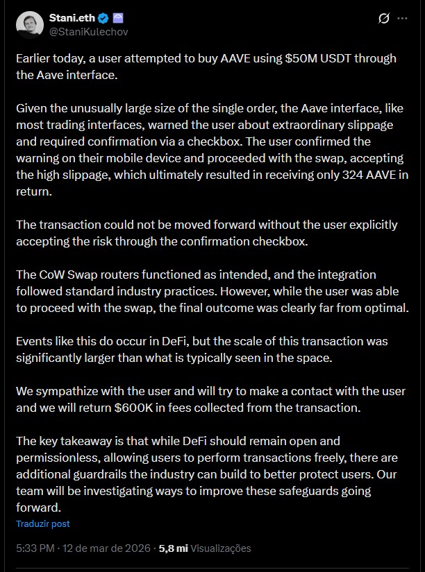 Stani Kulechov, fundador da Aave, afirma que o usuário realizou a troca através de sua plataforma, mas que um grande aviso de slippage (diferença entre preço esperado e executado) foi visto e confirmado pelo investidor.