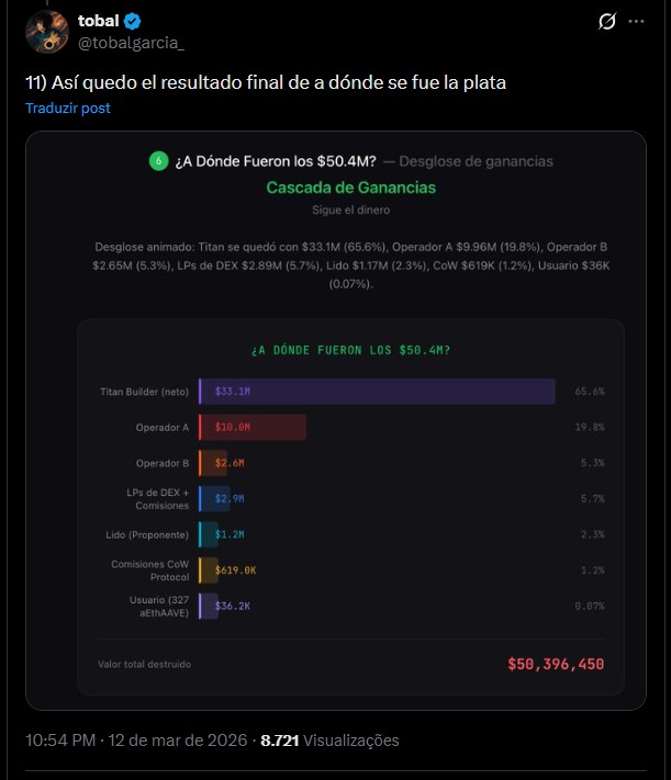 A Titan Builder, responsável por montar blocos de transações no Ethereum, acabou ficando com a maior parte, US$ 33,1 milhões. Na sequência, aparecem dois bots MEV identificados como Operadores A e B, que ficaram com US$ 10 milhões e US$ 2,6 milhões, respectivamente.