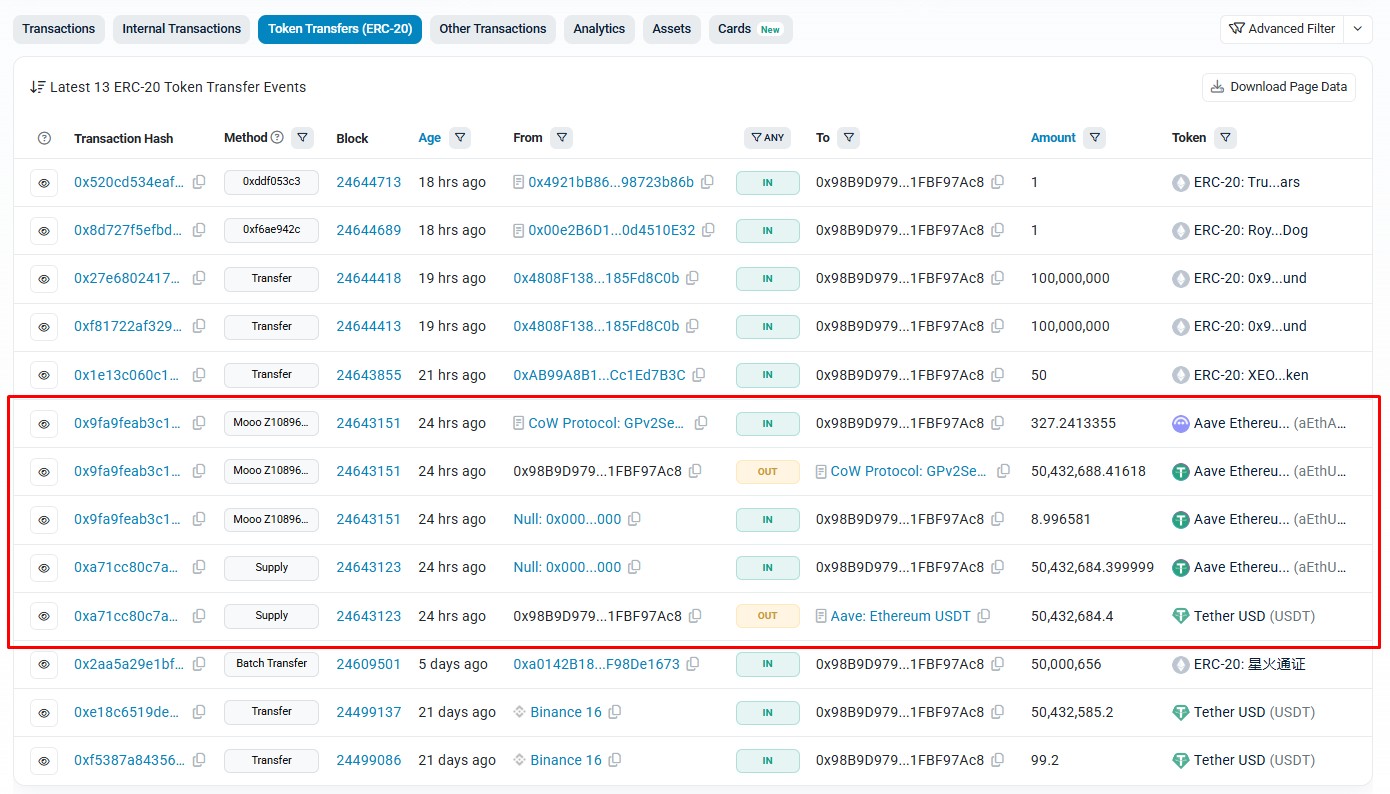 Dados on-chain mostram que o investidor trocou US$ 50,4 milhões em USDT pelo mesmo montante em aEthUSDT, um token que representa um depósito da stablecoin no protocolo Aave.