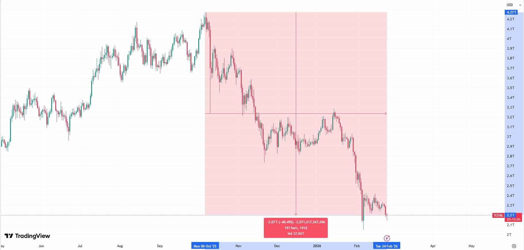 Dados do TradingView mostram que o mercado de criptomoedas saiu de US$ 4,27 trilhões para US$ 2,2 trilhões no período.