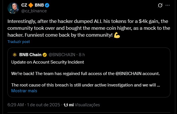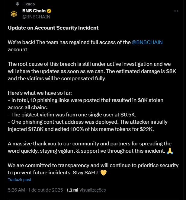 Conforme a BNB ultrapassou a faixa de US$ 1.000 pela primeira vez na história em setembro, este pode ter sido um dos motivos que fizeram o perfil da criptomoeda ser alvo de um ataque hacker nesta quarta-feira (1º).