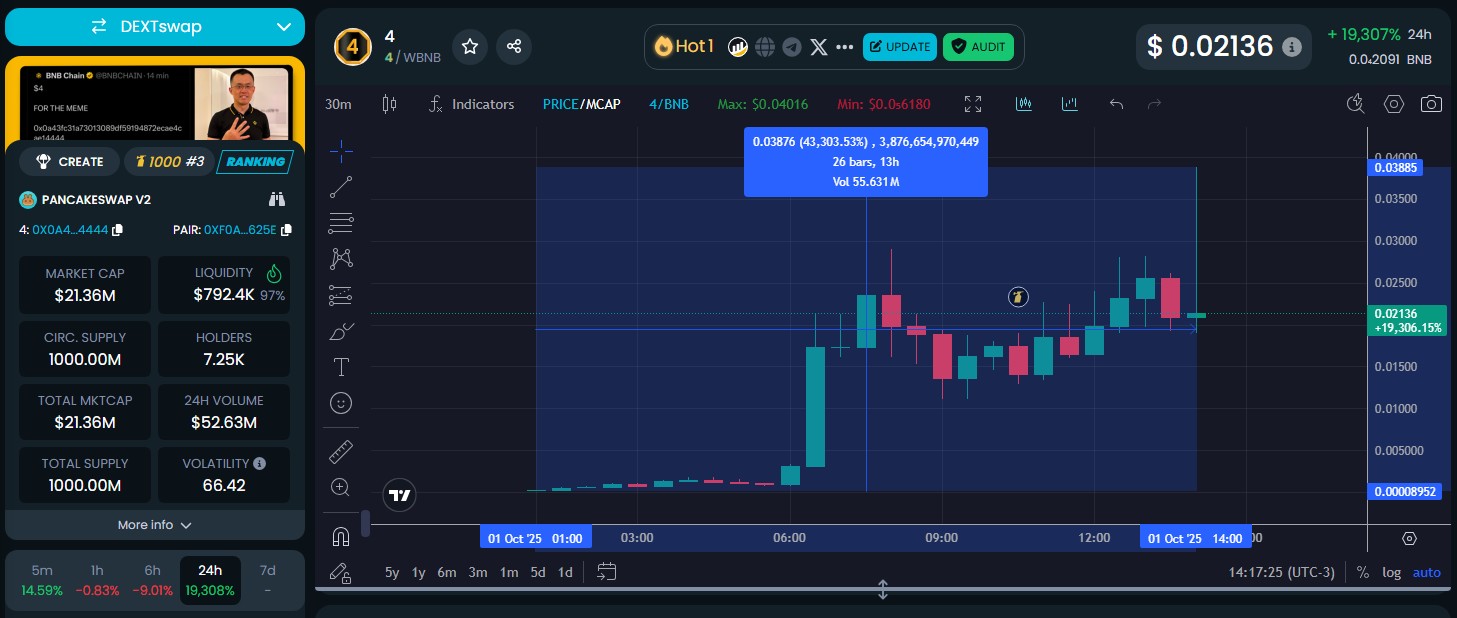 Outro ponto destacado pela BNB Chain é que o hacker investiu US$ 17,8 mil em sua própria memecoin, chamada “4”, mas saiu rapidamente de sua posição com US$ 22.000, ficando com um lucro de pouco mais de US$ 4.000.