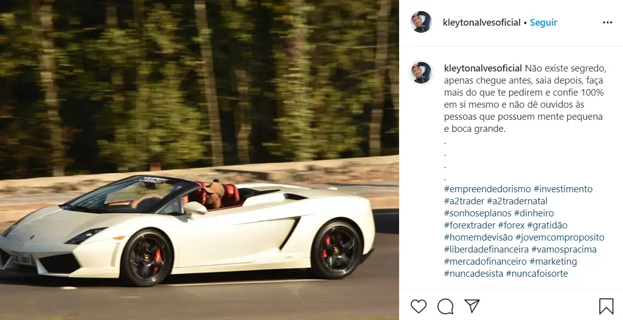 Klayton afirmou, além disso, que não se importa com o que os portais de notícias falam sobre ele. Segundo o fundador da A2 Trader, em seu Instagram, ele é um trader muito bom, que consegue fazer sim 4% ao dia e oferecer isso aos seus clientes.