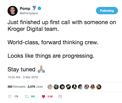 No dia 3 de março Anthony Pomplano (@APomplano), um especialista em criptomoedas, revelou no Twitter que discutiu pessoalmente com um representante da Kroger sobre auxiliar a rede de supermercados a adicionar pagamentos em criptos.