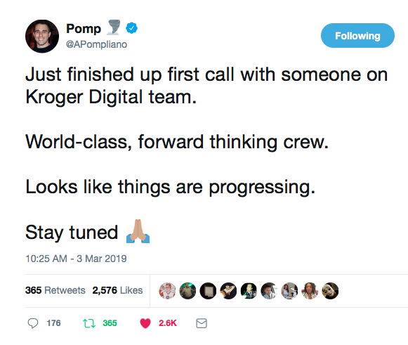 No dia 3 de março Anthony Pomplano (@APomplano), um especialista em criptomoedas, revelou no Twitter que discutiu pessoalmente com um representante da Kroger sobre auxiliar a rede de supermercados a adicionar pagamentos em criptos.