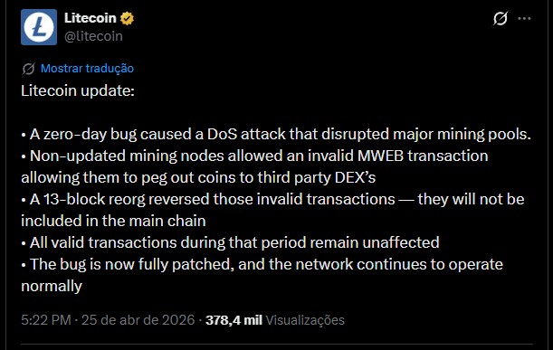 Pouco depois, os desenvolvedores liberaram a v0.21.5.4 do Litecoin Core, onde a vulnerabilidade explorada foi corrigida, e recomendaram que todos os usuários atualizassem seus nós para a nova versão.