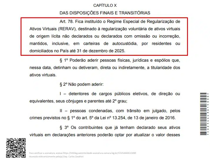 “Fica instituído o Regime Especial de Regularização de Ativos Virtuais (RERAV), destinado à regularização voluntária de ativos virtuais de origem lícita não declarados ou declarados com omissão ou incorreção, mantidos, inclusive, em carteiras de autocustódia, por residentes ou domiciliados no País até 31 de dezembro de 2025.”