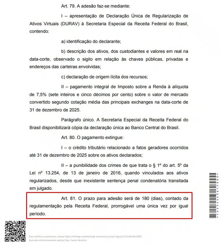 O texto prevê a adesão por pessoas físicas, jurídicas e espólios (patrimônios em inventário) que possuíam ou já possuíram criptomoedas até a data estabelecida.