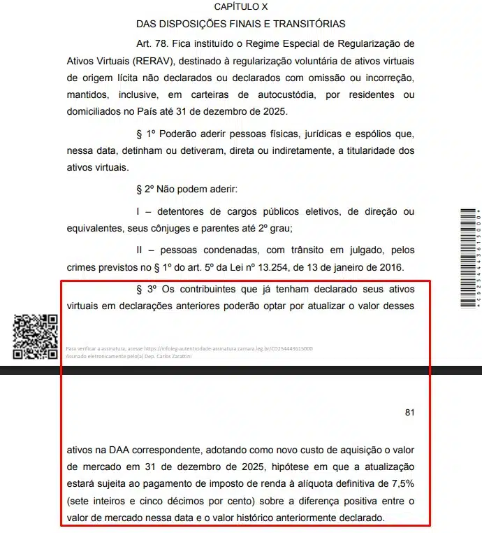 “Os contribuintes que já tenham declarado seus ativos virtuais em declarações anteriores poderão optar por atualizar o valor desses ativos na DAA correspondente, adotando como novo custo de aquisição o valor de mercado em 31 de dezembro de 2025, hipótese em que a atualização estará sujeita ao pagamento de imposto de renda à alíquota definitiva de 7,5% sobre a diferença positiva entre o valor de mercado nessa data e o valor histórico anteriormente declarado.”