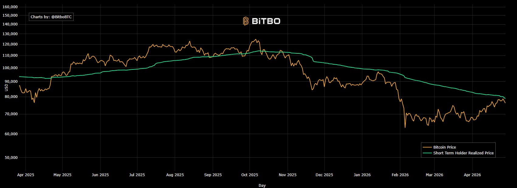 Preço médio de holders de curto-prazo (em verde) vs preço do Bitcoin (em laranja). Fonte: Bitbo.