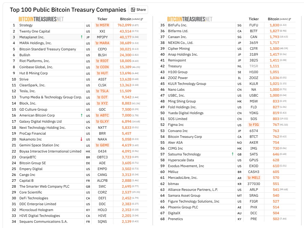 Dados do BitcoinTreasuries mostram que a Metaplanet subiu para a terceira posição dentre empresas públicas após o novo aporte, superando a mineradora Mara Holdings.