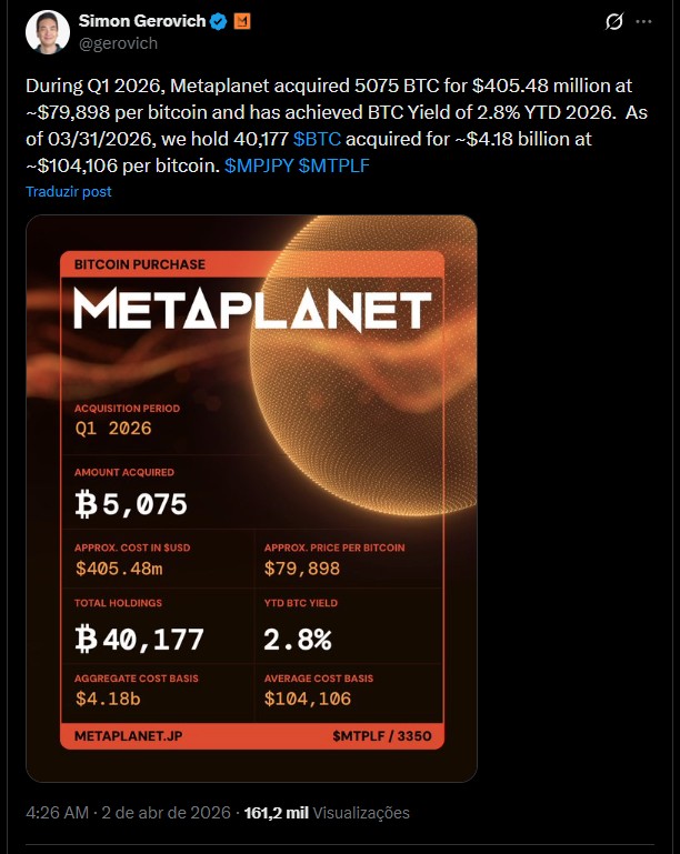 “Durante o primeiro trimestre de 2026, a Metaplanet adquiriu 5.075 BTC por US$ 405,48 milhões, a cerca de US$ 79.898 por bitcoin, e alcançou um BTC Yield de 2,8% no acumulado de 2026. Em 31/03/2026, detemos 40.177 BTC adquiridos por aproximadamente US$ 4,18 bilhões, a cerca de US$ 104.106 por bitcoin. $MPJPY $MTPLF”