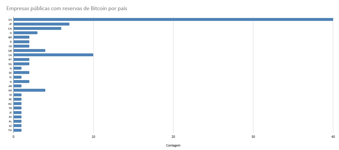 Dentre as 100 maiores reservas, 40 são mantidas por empresas americanas, 10 por canadenses, 7 por japonesas e 6 por chinesas, além de 3 de Hong Kong. O Brasil aparece com duas empresas, OranjeBTC e Méliuz.