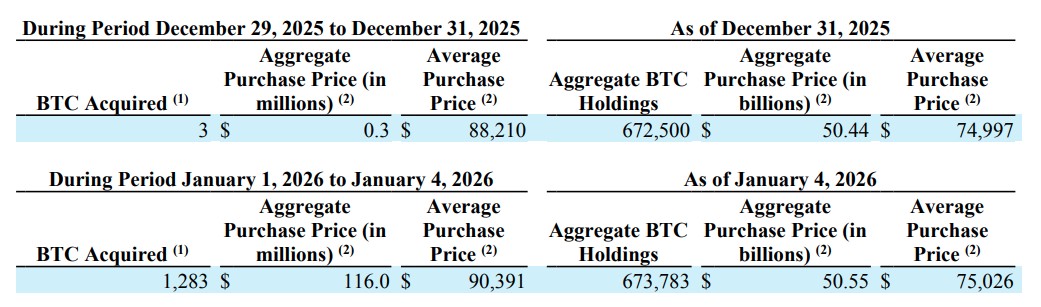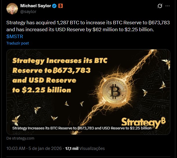 Apesar disso, eles continuam firmes com sua estratégia de acumulação de Bitcoin. Em nota compartilhada nas redes sociais, Saylor revelou o primeiro aporte de 2026.