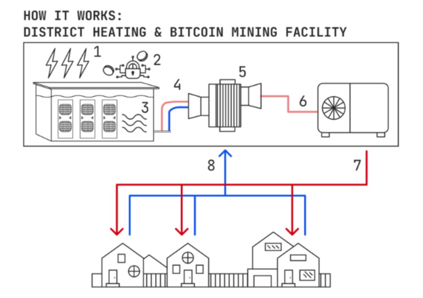 Após a água quente passar pelos aquecedores residenciais e ficar gelada novamente, ela então retorna para a mineradora, que repete o processo utilizando resfriamento líquido em suas máquinas.