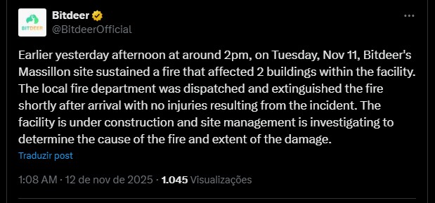 “No início da tarde de ontem, por volta das 14h, na terça-feira, 11 de novembro, o local da Bitdeer em Massillon sofreu um incêndio que afetou dois prédios dentro das instalações”, escreveu a Bitdeer. “O corpo de bombeiros local foi acionado e extinguiu o fogo pouco após a chegada, sem feridos resultantes do incidente.”