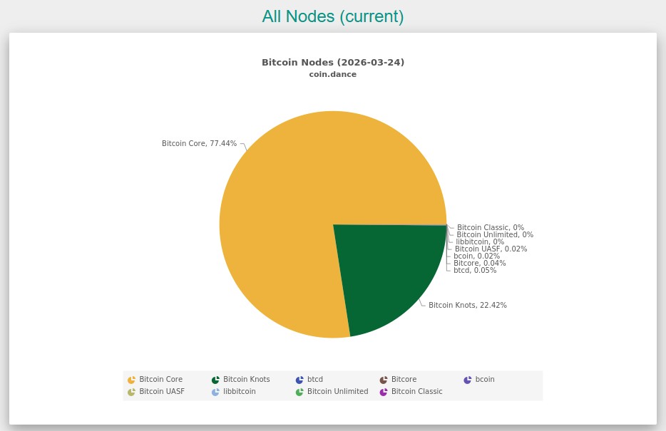 Atualmente, o Bitcoin Core é o software dominante entre usuários, com 17.708 dos 22.866 nodes públicos, seguido pelo Bitcoin Knots com 5.126, enquanto outras alternativas têm adoção limitada.