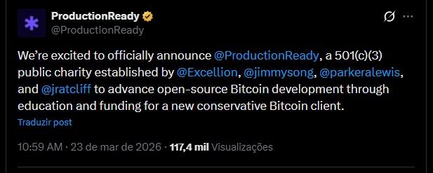 “Estamos empolgados em anunciar oficialmente a @ProductionReady, uma organização beneficente pública 501(c)(3) criada por @Excellion, @jimmysong, @parkeralewis e @jratcliff para avançar o desenvolvimento open source do Bitcoin por meio de educação e do financiamento de um novo cliente de Bitcoin com perfil conservador.”