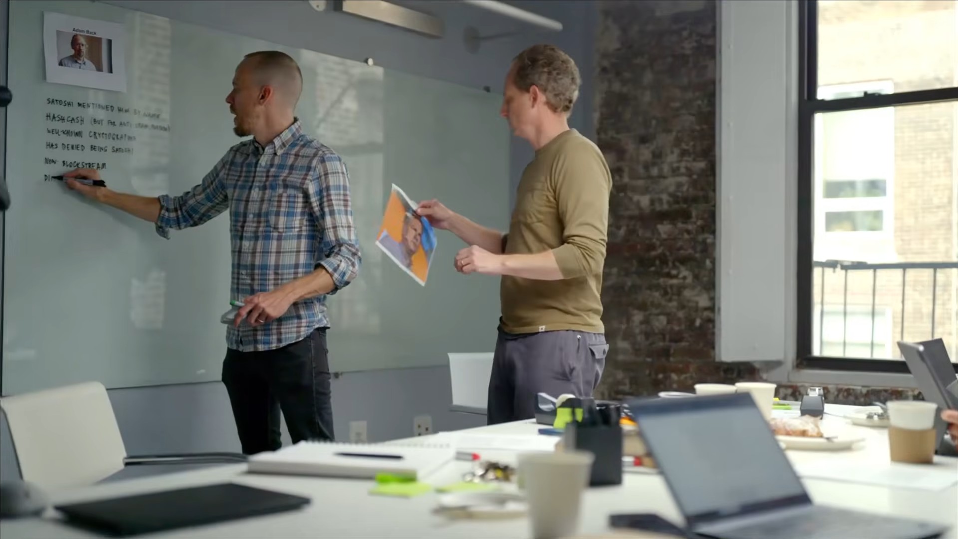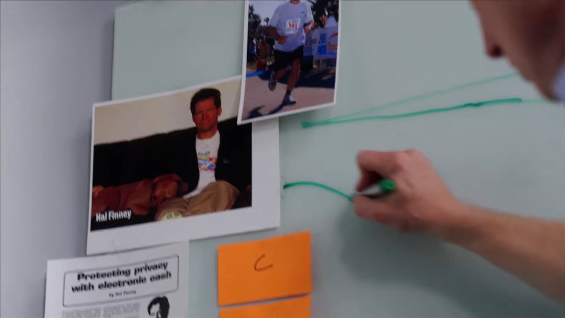 Dentre os nomes que aparecem em um quadro estão Hal Finney, criador do RPOW (Reusable Proofs of Work), e Adam Back, criador do Hashcash. Os dois sistemas são considerados pilares que deram vida ao Bitcoin.