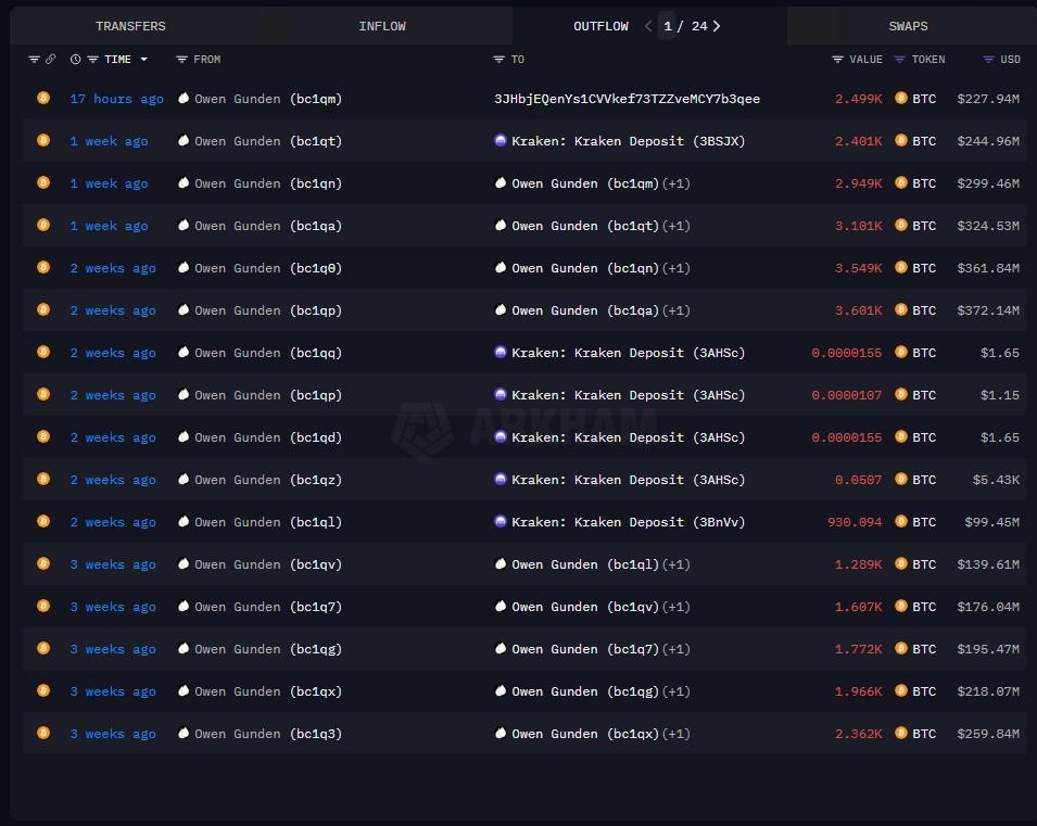 “Owen Gunden era uma antiga baleia de Bitcoin que mantinha BTC desde 2011”, escreveu a Arkham. “Desde o fim de outubro, ele vendeu 11 mil BTC no valor de US$ 1,3 bilhão. Ele acabou de transferir US$ 230 milhões em BTC para a Kraken, marcando sua venda final.”