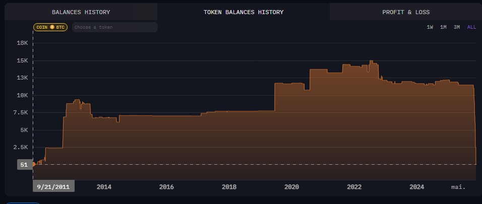 Embora seu saldo em Bitcoin tenha flutuado ao longo dos 14 anos, suas carteiras sempre tiveram próximas de 10 mil bitcoins desde 2012.
