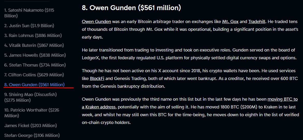 Gunden era a 3ª maior baleia de criptomoedas do mundo, segundo dados on-chain da Arkham, ficando atrás somente de Satoshi Nakamoto e Justin Sun
