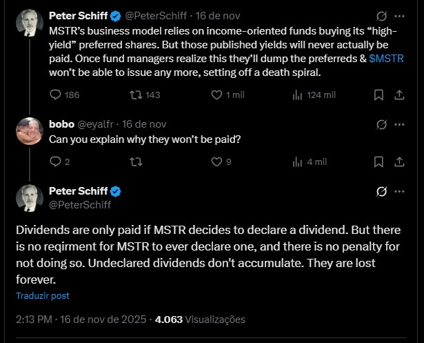 Questionado por um de seus seguidores sobre os dizeres que esses rendimentos não serão pagos, Schiff explicou que isso só acontece se a Strategy declarar um dividendo.