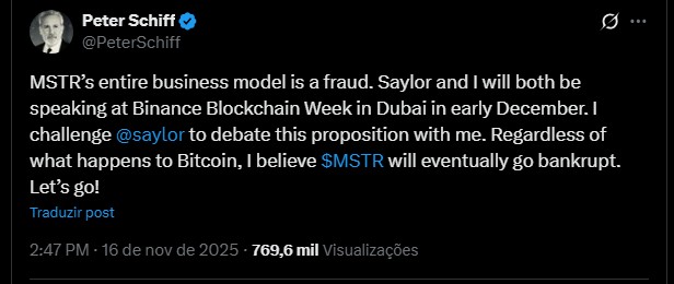 “Todo o modelo de negócios da MSTR é uma fraude. Saylor e eu estaremos falando na Binance Blockchain Week, em Dubai, no começo de dezembro”, iniciou Schiff.