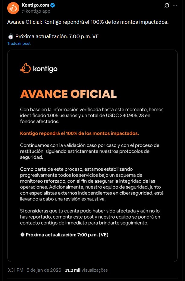 A Kontigo, um neobanco que trabalha com stablecoins na América Latina, confirmou nesta segunda-feira (5) que foi alvo de um ataque hacker. Nos comentários, diversos usuários relataram saques indevidos de criptomoedas de suas contas.