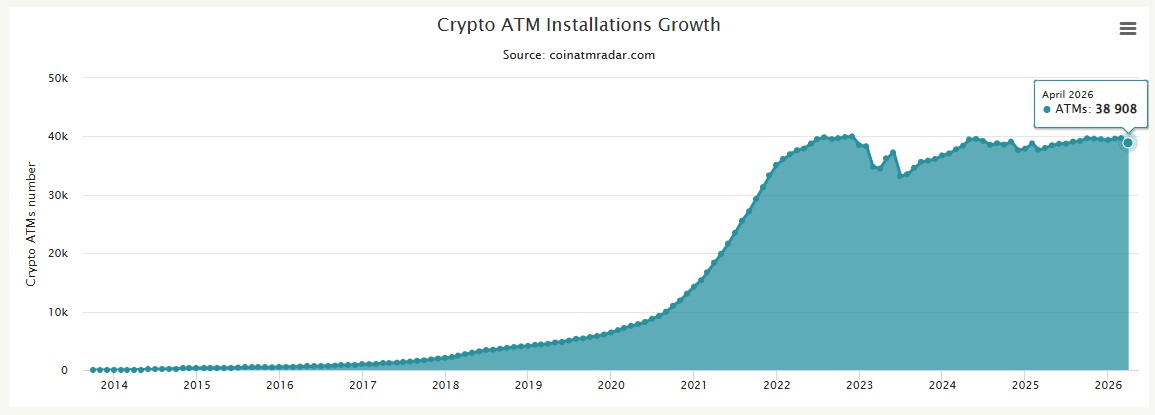 Dados do Coin ATM Radar revelam que o número de caixas eletrônicos chegou a 39.990 em dezembro de 2022, um crescimento de três vezes em dois anos. No entanto, a adoção ficou estagnada nos últimos quatro anos.