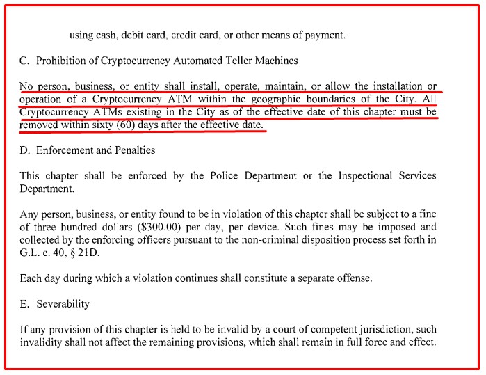 “Nenhuma pessoa, empresa ou entidade deverá instalar, operar, manter ou permitir a instalação ou operação de um ATM de criptomoeda dentro dos limites geográficos da Cidade. Todos os ATMs de criptomoedas existentes na Cidade na data de vigência deste capítulo devem ser removidos dentro de sessenta (60) dias após a data de vigência.”