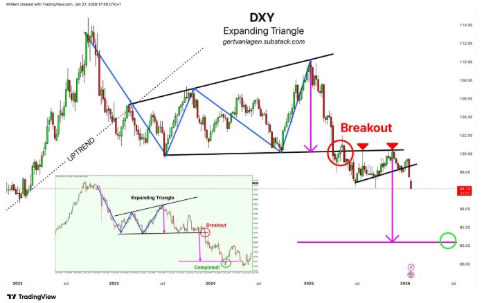 A mínima de quatro anos do DXY reflete as crescentes preocupações com a estabilidade do governo e a sustentabilidade fiscal. De acordo com dados da Polymarket, as chances de um fechamento do governo dos EUA ter a taxa de desemprego subiu para 80% em meio a tensões em torno da política de imigração e do financiamento do ICE (Serviço de Imigração e Alfândega dos EUA) e da Patrulha da Fronteira. Além disso, a dívida pública continua a aumentar, ultrapassando agora os 38 trilhões de dólares, com o CEO do JPMorgan, Jamie Dimon, alertando que essa trajetória é insustentável.
