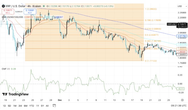 Indicadores técnicos permanecem cautelosos, já que o gráfico do XRP continua a desenhar máximas mais baixas no gráfico de 4 horas, enquanto o preço permanece limitado abaixo das principais médias móveis. Aglomerados de oferta estão se formando entre US$ 1,93 e US$ 1,95, com a resistência aumentando na faixa de US$ 2,02 a US$ 2,18.