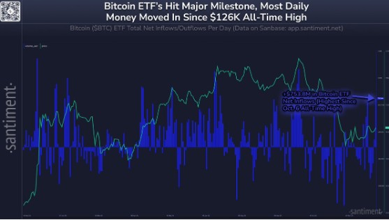 Os fluxos de entrada em ETFs spot de Bitcoin também desempenharam um papel importante no suporte à alta desta semana. Somente na terça-feira, as entradas líquidas em ETFs ultrapassaram US$ 753 milhões.segO segundo maior volume diário desde a queda do mercado em outubro. Esse influxo seguiu-se a uma semana anterior de saídas, marcando uma mudança importante no posicionamento institucional.