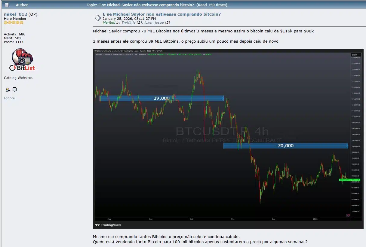 Bitcoin opera em baixa, mas a comunidade acredita que a queda seria muito maior caso Strategy não estivesse comprando. Fonte: Bitcointalk.