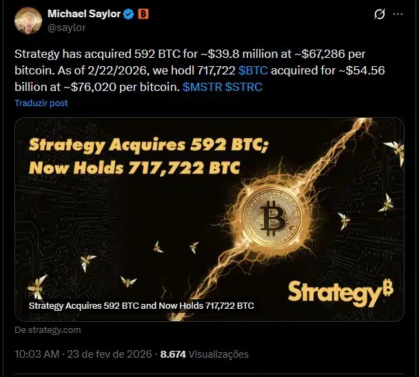 “A Strategy adquiriu 592 BTC por cerca de US$ 39,8 milhões, a aproximadamente US$ 67.286 por bitcoin. Em 22/02/2026, mantemos 717.722 BTC adquiridos por cerca de US$ 54,56 bilhões, a aproximadamente US$ 76.020 por bitcoin.”