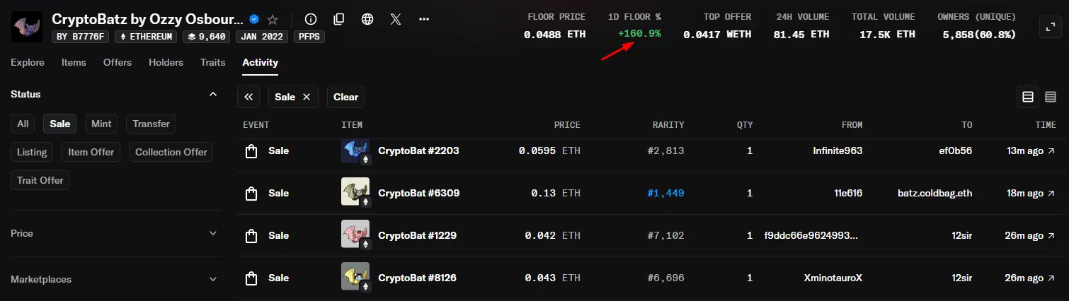 Mesmo assim, o preço mínimo da coleção NFT CryptoBatz subiu 161% nas últimas 24 horas, mostrando que as negociações atraíram um novo volume para os itens em blockchain. Ao todo, 81 eths (R$ 1,6 milhão) se movimentaram em negociações da coleção, apurou o Livecoins.