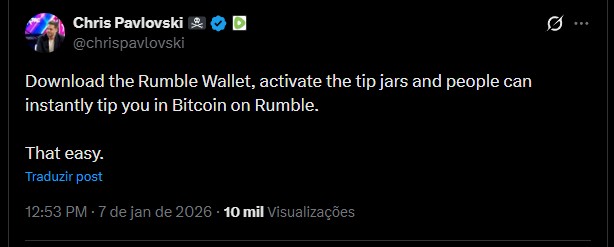 “Baixe a Rumble Wallet, ative os potes de gorjeta e as pessoas poderão lhe enviar gorjetas instantaneamente em Bitcoin no Rumble.”
