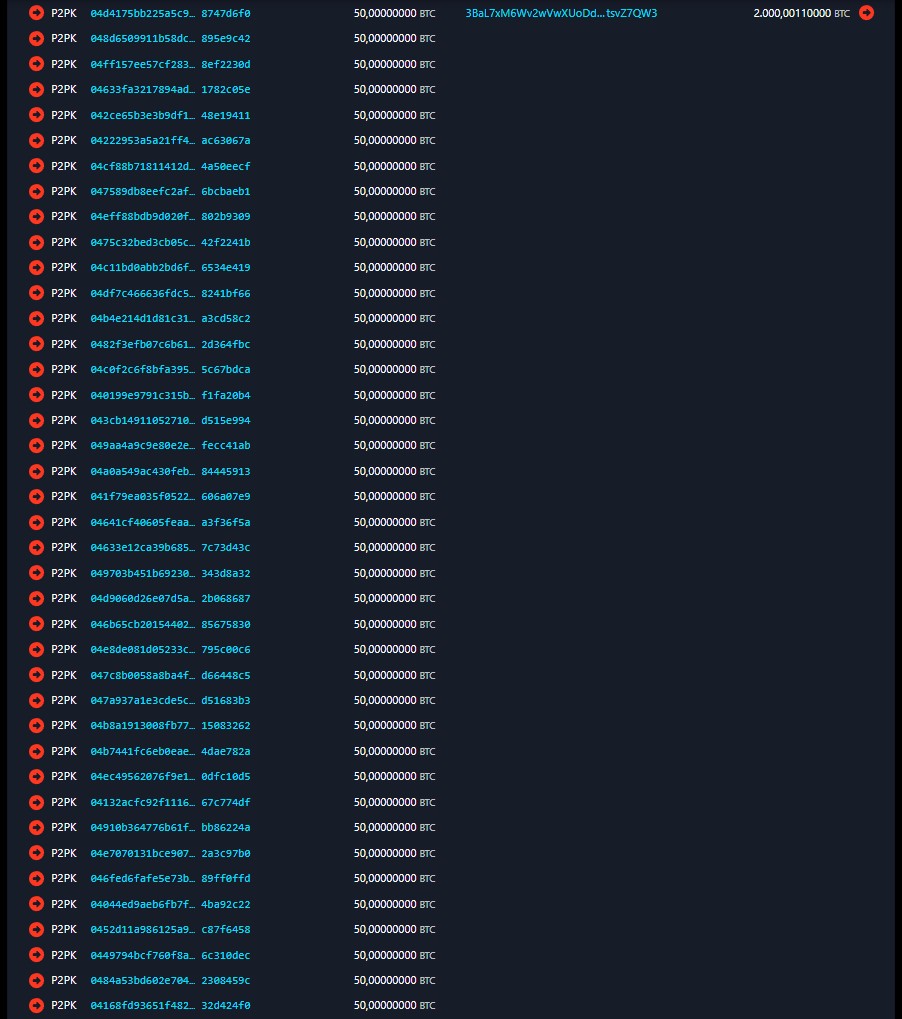 As moedas estavam divididas em 40 endereços, cada qual com 50 bitcoins. Isso porque essa era a recompensa padrão por bloco na época.