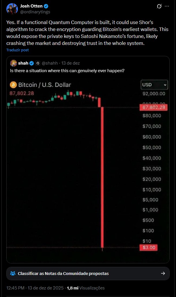 A comunidade do Bitcoin entrou uma longa discussão neste final de semana sobre o que faria o preço da criptomoeda cair dos atuais US$ 89.000 para somente 3 dólares. Um investidor citou a chegada dos computadores quânticos como um possível cenário, gerando centenas de comentários.