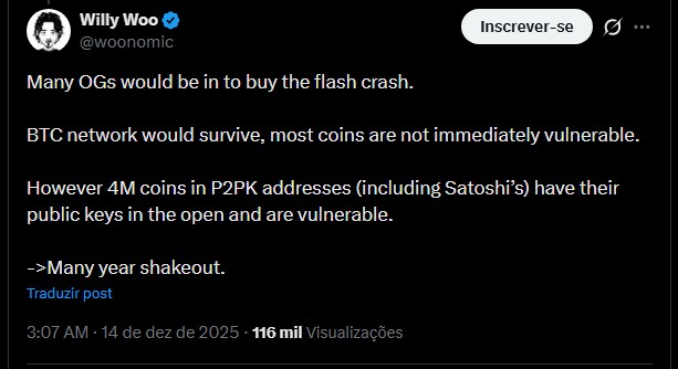 “A rede do BTC sobreviveria; a maioria das moedas não é imediatamente vulnerável. No entanto, 4 milhões de moedas em endereços P2PK (incluindo as do Satoshi) têm suas chaves públicas expostas e são vulneráveis”, escreveu o analista, adicionando que isso levaria a “anos de desestabilização no mercado”.
