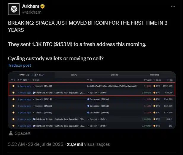 A SpaceX, empresa aeroespacial de Elon Musk, moveu seus bitcoins pela primeira vez em três anos nesta terça-feira (22). Analistas tentam descobrir se a empresa está vendendo suas moedas ou apenas transferindo para novos endereços.