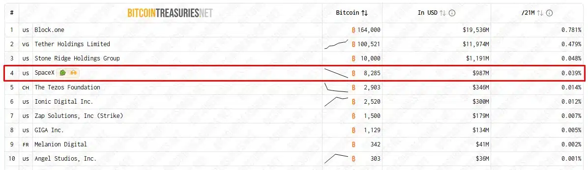 Dados da Bitcoin Treasuries colocam a empresa de Elon Musk entre as 5 maiores dentre as privadas, ficando atrás apenas da Block.one (responsável pela EOS), Tether e Stone Ridge.