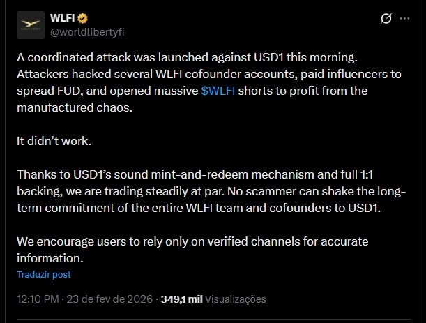 “Um ataque coordenado foi lançado contra o USD1 esta manhã. Os atacantes hackearam várias contas de cofundadores da WLFI, pagaram influenciadores para espalhar FUD e abriram grandes posições vendidas em $WLFI para lucrar com o caos fabricado.”