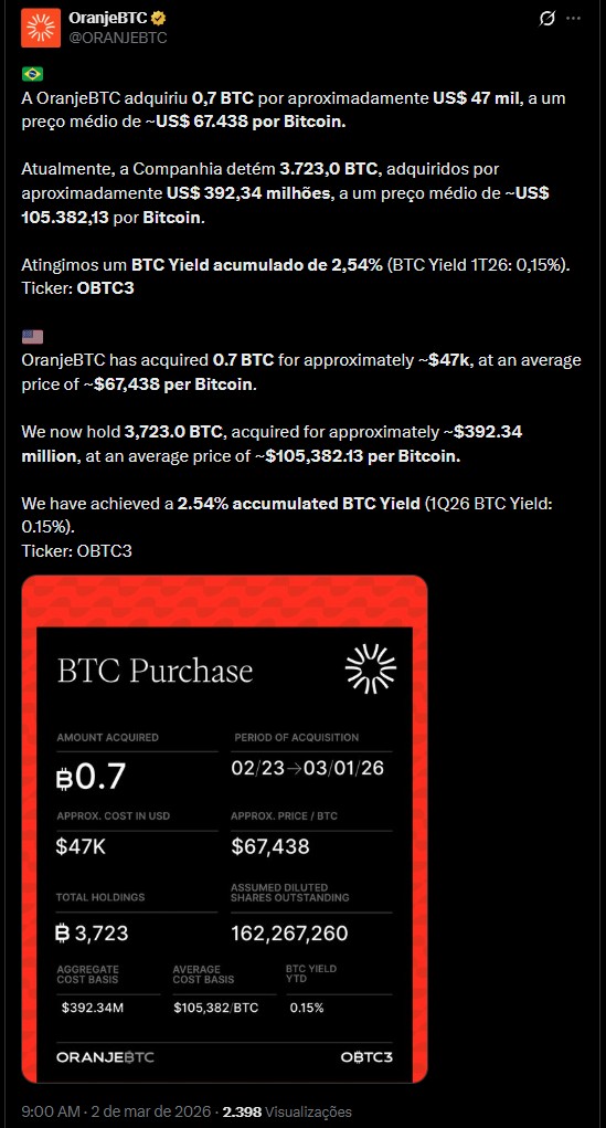 “A OranjeBTC adquiriu 0,7 BTC por aproximadamente US$ 47 mil, a um preço médio de ~US$ 67.438 por Bitcoin.”