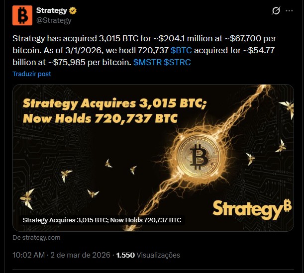 “A Strategy adquiriu 3.015 BTC por aproximadamente US$ 204,1 milhões, a cerca de US$ 67.700 por bitcoin. Em 01/03/2026, mantemos 720.737 BTC adquiridos por aproximadamente US$ 54,77 bilhões, a cerca de US$ 75.985 por bitcoin.”