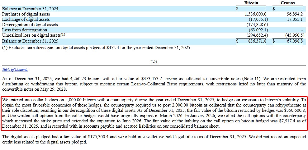 “Firmamos hedges do tipo collar sobre 4.000,00 bitcoin com uma contraparte durante o ano encerrado em 31 de dezembro de 2025 para proteger nossa exposição à volatilidade do bitcoin”, escreveu a TMTG, notando que precisou entregar 2.000 bitcoins para a contraparte como garantia.