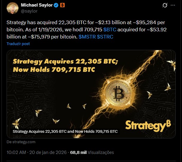 “Em 19/01/2026, mantemos 709.715 BTC adquiridos por cerca de US$ 53,92 bilhões, a aproximadamente US$ 75.979 por bitcoin”, escreveu Saylor.
